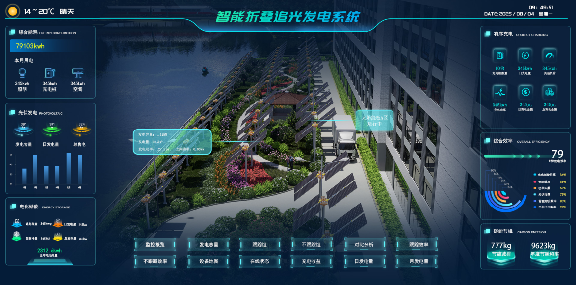 智慧光农生态融合则通过自主研发的智能折叠追光发电系统,透光率可调50%-90%,配合双轴跟踪智能追光技术,光伏板全天候追踪太阳轨迹,无光照盲区,满足农作物的生长需要,实现了"上方清洁发电、下方高效种植"的农光互补新模式,让土地综合利用率与农作物产量双提升,构建了 “农业固碳 + 光伏减排” 的复合生态系统。