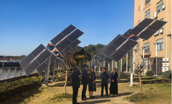 考察期间,专家团队深入上海兴邺示范项目基地一线,实地察看智能折叠追光发电系统的运行实况,详细询问产品的技术原理、创新优势、应用场景及落地成效。